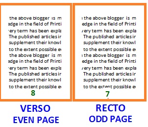 16. Recto Verso: Recto and Verso means both sides of printing i.e front and back side. When a book is opened, one can always note that the first page always begin with the matter in right side page which will begin with No 1, an odd no. The left side pages will always have the even nos. The even numbered pages are called as Verso pages and the Odd no pages are called Recto pages.